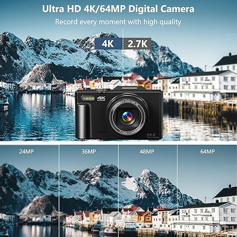 - 【Autofocus 64MP & UHD 4K Digital Camera】The digital camera can make YouTube 4K videos and take 64 MP UHD pictures. High quality images and high pixel video sensor can capture every memorable moment clearly.4k vlogging camera has three focus modes: auto focus, manual focus and fixed focus, you can set the focus mode according to your needs. It is a perfect photography cameras for beginners